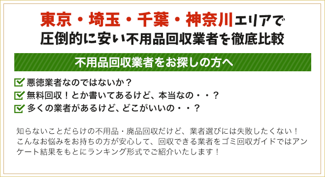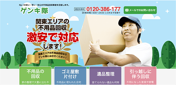 関東エリアの不用品回収なら最安値のゲンキ隊。問い合わせから、回収まで素早く対応しています。不用品回収だけでなく、遺品整理・その後の清掃まで全てをお任せできます。