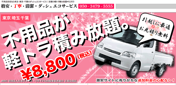 東京・埼玉・千葉の不用品回収、出張買取サービスのダッシュエコサービス。年中無休で、電話一本で素早く対応してくれますので、高齢者も安心です。不用品に合わせた積み放題パックが用意され、びっくりの低価格。完全定額で、追加料金はんし!分別から掃除まで、スタッフが全て行います。エアコンの取り外し、回収も無料です。